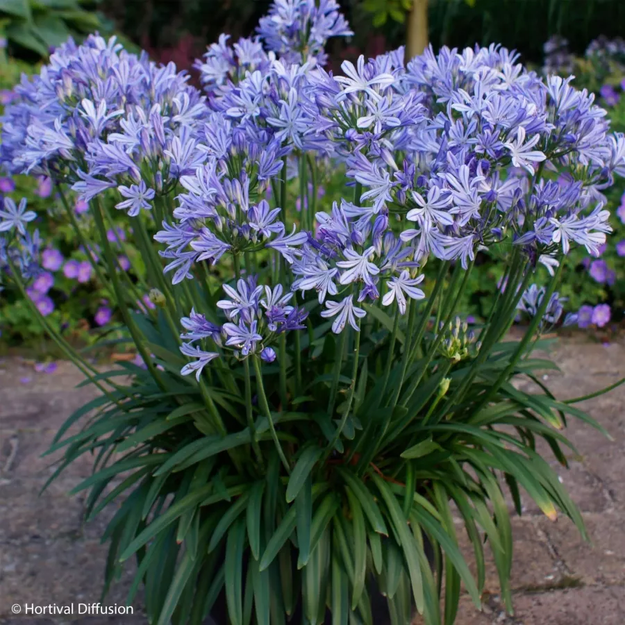Ses fleurs en ombelles sont d'un bleu clair veiné de bleu-violacé plus sombre.